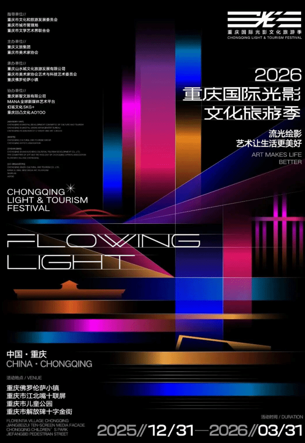 本届国际文旅季由重庆市文旅委、市城管局、市文联指导,重庆文旅集团、重庆市美协、四川美术学院联合主办,汇聚国内外顶尖艺术团队及中央美术学院、广州美术学院、中国传媒大学等11所院校近50件佳作,搭建起国际高水平灯光文旅交流平台。